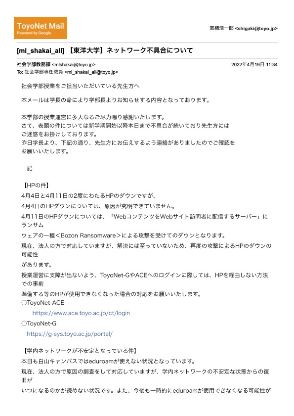 教務より大学のネットワークが不安定なため、Toyonetaceなどは大学のウェブを介しない方法でアクセスしてほしいとの連絡あり(詳細内容最下位添付)。