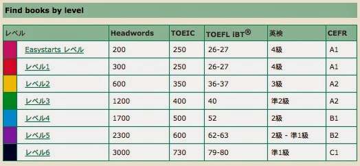 以下、いくつか出版社および本を紹介する。またGraded Readerの目安表をPenguin Booksを例に掲載しておく。大学に提出したTOEICの点数を目安にして決めてもいいし、自分の読みたいものを選択し頑張って読んでみて、上のガイドラインを見て調整しながら、自分にあったレベルからスタートしよう。継続を目的とするので、難しすぎるのをいきなり読まないこと。「大学ではこれぐらいは読もう」と英語の先生に言われるかもしれないけれど、しょうがない。読めるレベルからスタートする。スポーツもいきなり、泳げない人に水泳全国大会にでろとはいわない。アクロバットを全く出来ない人にやらせて頭から落ちられたら困る。最初は補助がつく。